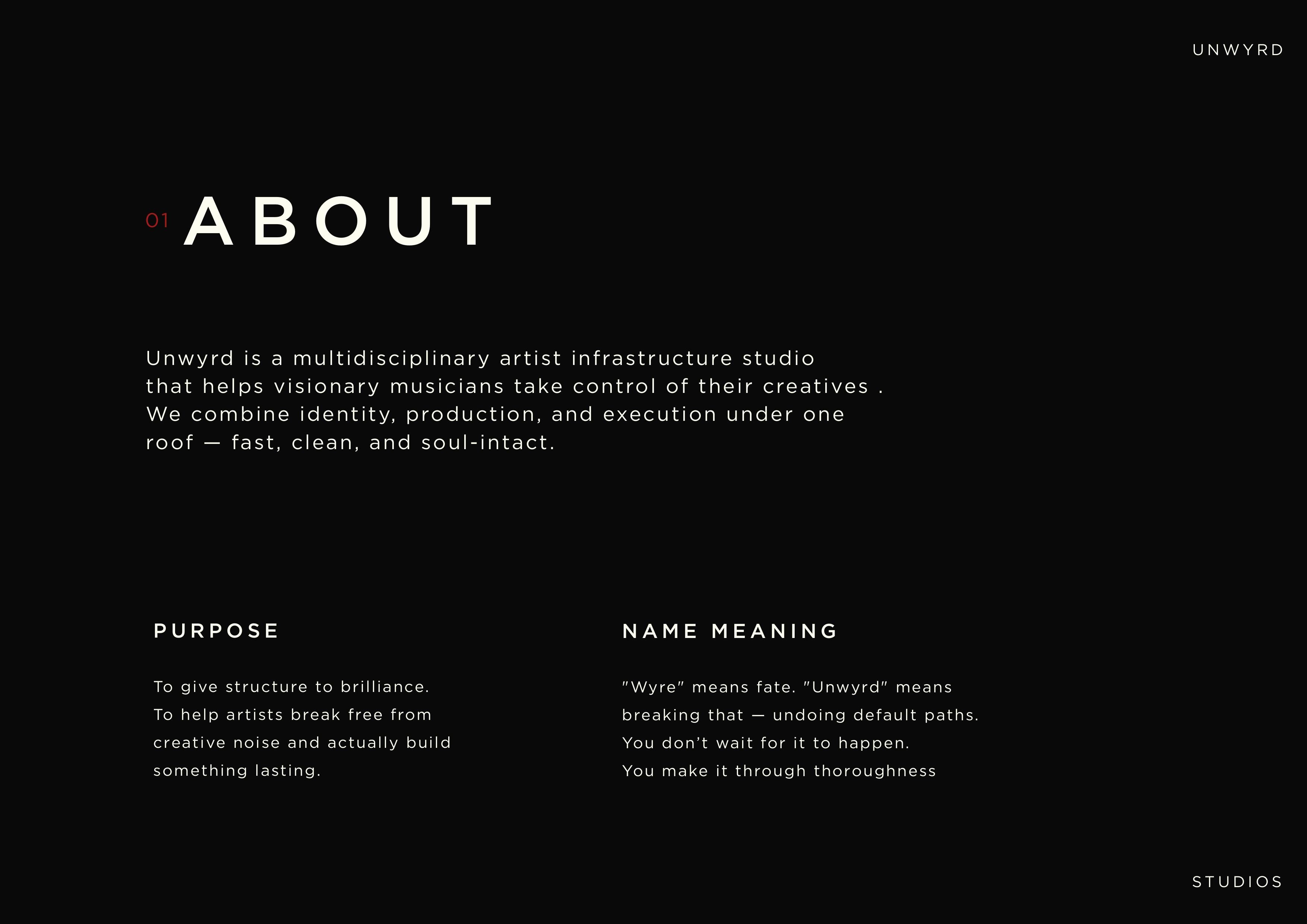 We developed a bold and distinctive brand identity for Unwyrd Studio, a music production brand rooted in creativity and experimentation. The branding reflects the studio’s artistic culture and unconventional sound. It helps position Unwyrd as a modern, independent creative space.